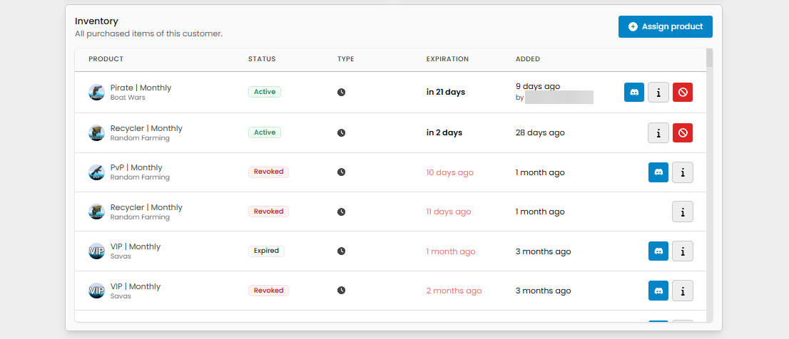 Red Button (Revoke): Allows you to revoke the active item from the customer, removing their access to the purchased package. This is useful for cases where the package needs to be manually canceled or removed.