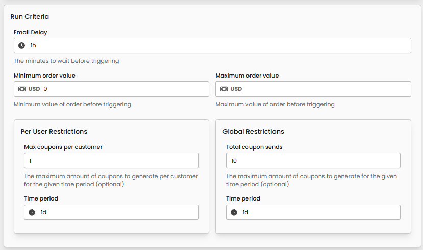 Time to wait after an abandoned checkout before sending the email. (e.g. 1 hour)