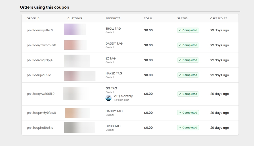 This section displays all orders that have used or been associated with this coupon.