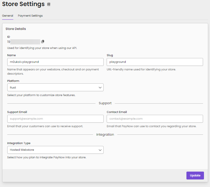 * **ID**: This is a unique identifier for your store, used when integrating with the PayNow API.