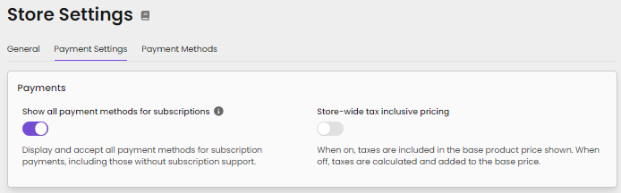 In Payment Settings, you can control global payment options for your store, including showing all payment methods for subscriptions and enabling store-wide tax-inclusive pricing.