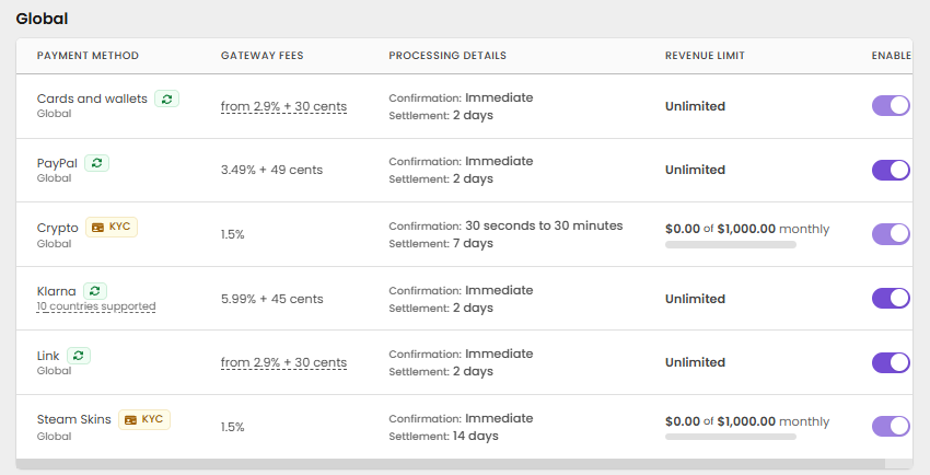 The Payment Methods section allows you to manage various payment options for your store. Payment methods are organized into Global and regional tabs.&#x20;